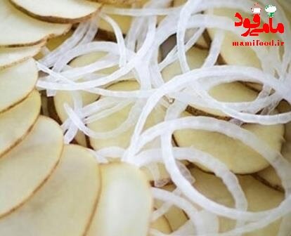 ابتدا سیب زمینی ها را پوست گرفته و به صورت حلقه ای خرد کنید. پیازها را نیز به همین شکل خرد کنید. حلقه ها تا جاي ممكن نازك باشند.