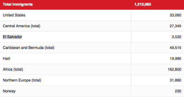 اگر به جدول دقت کنید، می بینید که طی 5 سال گذشته تنها 230 مهاجر از نروژ به کشور وارد شدند. در حالی که 3 هزار و 530 نفر از السالوادور، 49 هزار و 515 نفر از کارائیب و برمودا و 19 هزار و 990 نفر از هاییتی به کشور وارد شدند. اینها در کنار کشورهای آفریقایی، از نظر ترامپ تلقی می شوند.