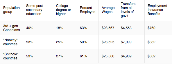 40 درصد از کانادایی هایی که به مدت 3 نسل یا بیشتر در کانادا زندگی کرده اند، حداقل دارای دیپلم کالج و 18 درصد دارای مدرک لیسانس هستند. در مقایسه، 53 درصد از مهاجران تحصیلات عالی دارند. 28 درصد از مهاجران دارای مدرک لیسانس، از کشورهای به اصطلاح "چاله مستراح" آمده اند. بنابراین می بینید که سطح مهارت و دانش این مهاجران به مراتب بیشتر از مهاجران اروپایی و کانادایی هایی است که نسل اندر نسل در این کشور زندگی کرده اند.