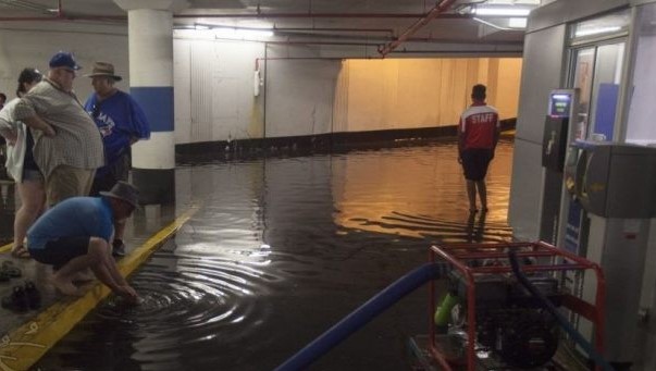 Toronto Blue Jays fans get stuck in the Rogers Centre as the entrance to the parking garage floods with torrential rain, in Toronto on August 7, 2018. (Fred Thornhill / THE CANADIAN PRESS)