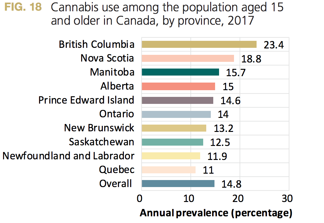 بیشترین میزان مصرف در سال 2017 متعلق به بریتیش کلمبیا است، 23.4% ساکنان بالای 15 سال این استان تاکید کرده اند از مخدر استفاده میکنند.