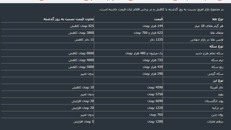همچنین سکه که در روز گذشته افزایش قیمت پیدا کرده بود، امروز روند آن معکوس شده و در جهت کاهش قیمت حرکت کرده است.