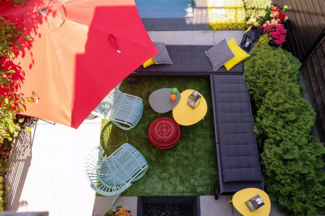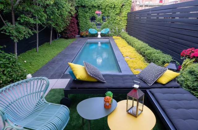 و اما خارج این خانه یک حیاط است. اگرچه این حیاط بزرگ نیست ولی بسیار زیبا درست و با ظرافت درست شده است. خصوصاً سرسبزی حیاط چشمگیر است و یک استخر زیبا برای بچه ها دارد که ایمن و شاد شنا کنند.