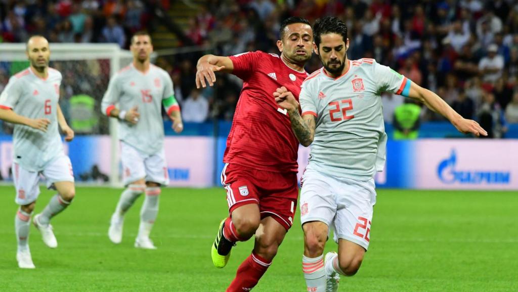 تیم ملی فوتبال ایران در دومین بازی خود در جام جهانی ٢٠١٨، با قدرت بسیار در برابر اسپانیا ظاهر شد و هر چند در دقایق نخست بازی با حملات پی درپی حریف روبرو گردید، اما دیوار دفاع ایران فرصت عبور به بازیکنان رقیب نداد. دروازۀ ایران با این حال با ضربۀ دیگو کوستا گشوده شد و گُلِ سعید عزت‌اللهی با اعلام آفساید داور کمکی پذیرفته نشد. زنان برای نخستین بار در ٤٠ سال اخیر برای تماشای یک بازی موفق به حضور در ورزشگاه آزادی شدند.