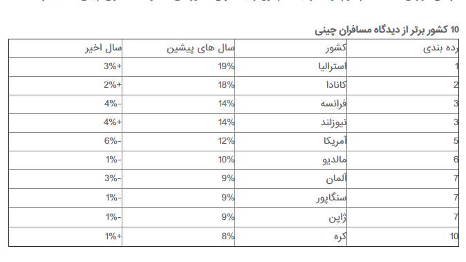 در این گزارش کانادا مقام دوم، و استرالیا مقام اول را به عنوان کشورهای محبوب مسافران چینی کسب کردند.