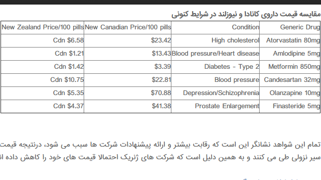 با مقایسه قیمت های جدید اقلام دارویی کانادا با نیوزیلند در فهرست، به نمونه های زیادی دست یافتیم که در آن کانادایی ها دو تا ده برابر بیشتر از دولت نیوزیلند تحت استفاده از طرح داروهای جهانی قرار دارند.