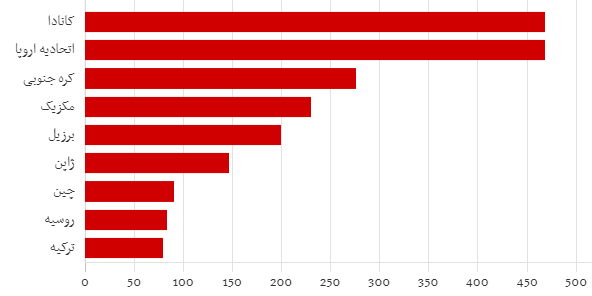 بنابر گزارش وزارت اقتصاد آمریکا کانادا با بیش از ۴۵۰ میلیون دلار صادرات فولاد به آمریکا در صدر جدول قرار دارد و پس از این کشور اتحادیه اروپا با رقمی مشابه (۴۵۰ میلیون دلار) و کره جنوبی با حدود ۲۷۰ میلیون دارد در رتبههای دوم و سوم قرار دارند. مکزیک، برزیل، ژاپن و تایوان هم که همگی از متحدان استراتژیک آمریکا محسوب میشوند در رتبههای بعدی صادرکنندگان عمده فولاد به آمریکا هستند.