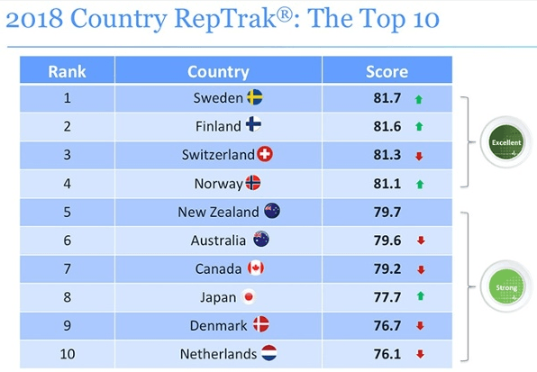 Rep Trak Reputation Institute’s Country، یکی از بزرگترین موسسات تحقیقاتی جهان که سالانه اعتبار سنجی کشورهای مختلف را انجام میدهد، این رتبه بندی را منتشر کرده است.